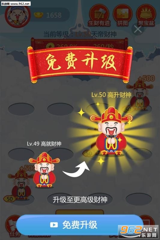 2、财神的经验值会不断的提升,那么自己能够带来的收益也是越来越多,金币也会更多。