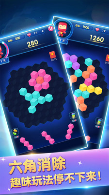 游戏中出现颜色各异的六边形,拖动各个形状的六角方块放入棋盘中,如果填满任意一行就可以产生消除,连续消除会有额外加分。棋盘上无法摆下任意一个六边形组合的时候,游戏结束。