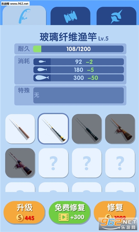 2、升级你的钓鱼装备能够让你在起钩的时候鱼儿不易逃跑,让你钓鱼成功率更高;