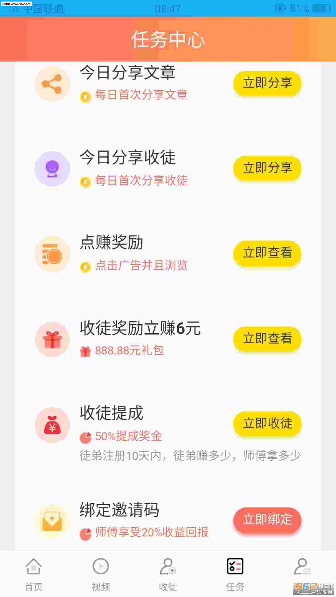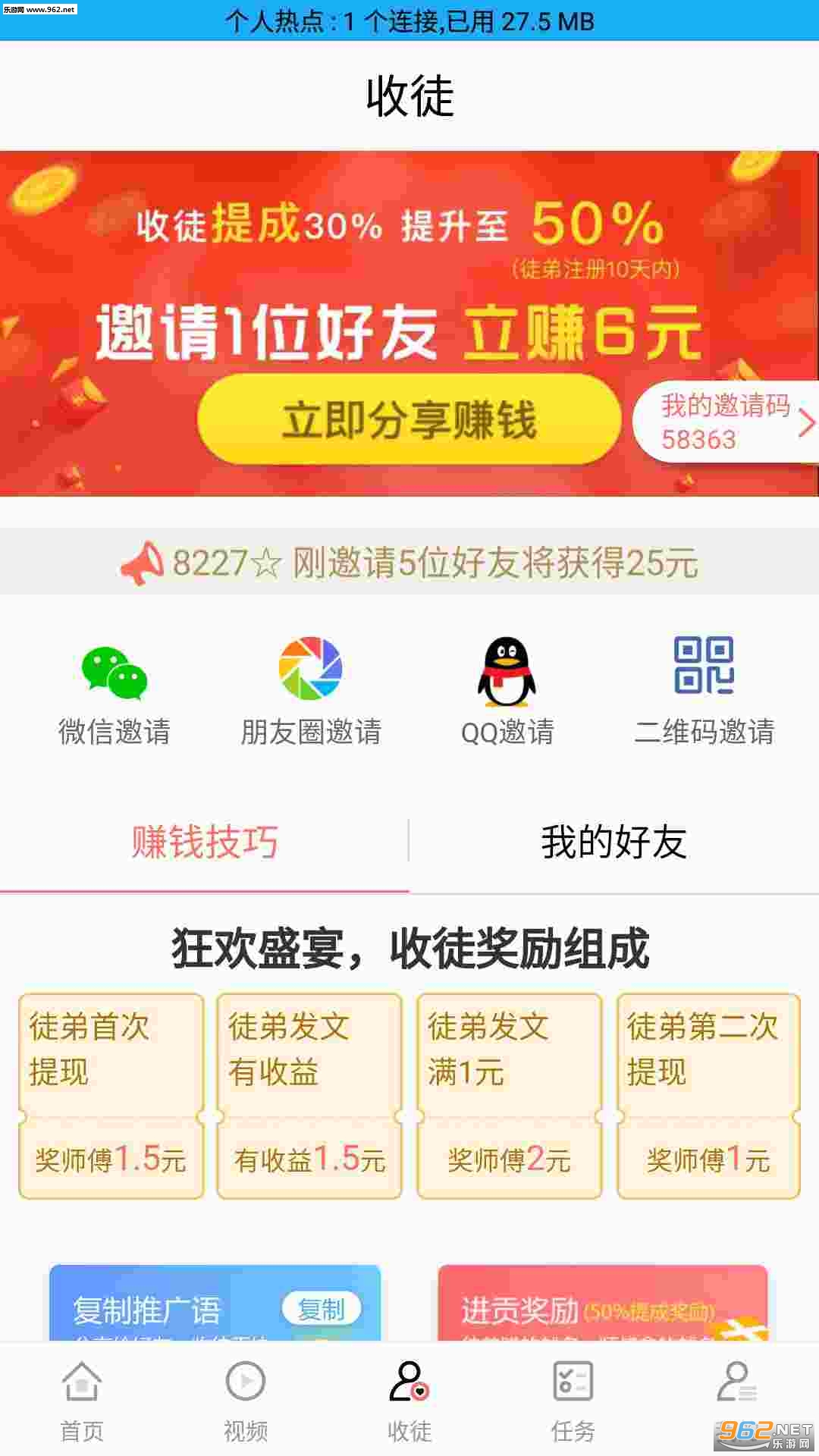 一款非常给力轻松的赚钱app,简单的赚钱方式,完美的赚钱体验,不但非常适合打发无聊的时间,还能通过收徒来赚分红,喜欢的朋友还在等什么?快来试试吧!