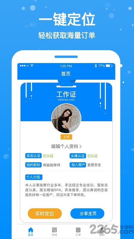 服务于按摩技师的接单工具,致力于为技师提升线上接单能力和处理订单的能力。使用按个摩技师端你可以实时定位,不用坐班,在线接单。