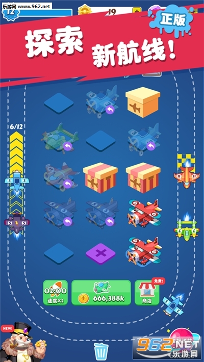 1、轻松简单合并玩法,通过合并升级你的飞机,选择不同的航线来进行飞行;