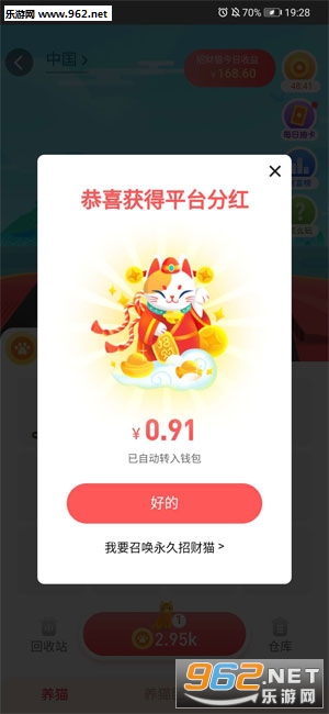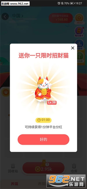 2、两只37级猫,有机会合成38级招财猫,每天参与平台现金分红
