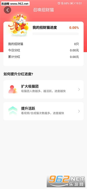 3、进度条满100%,必定合成招财猫,每天参与现金分红(解锁进度与团队人数、看视频数有关)