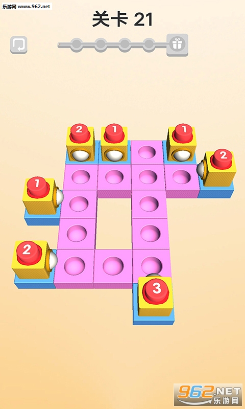 游戏中需要注意每个发射方块,上面都显示着其包含的球球的数量,每个关卡中这些球球的总数量和球洞的总数量是一样的,玩家只需轻轻点击发射方块即可全部发射出去;合理安排发射顺序才能使所有的球球回到洞里,否则闯关失败哦!