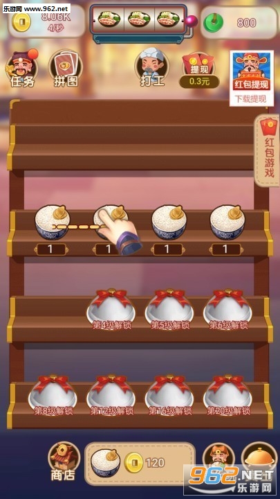 《一起来烹饪红包版》是一款能赚红包的休闲合成模拟经营游戏,游戏中玩家会经营着一家饭店,你可以通过拖曳合成的方式来解锁不同的食物菜肴,然后用这些食物来招待你的客人,从客人那里获得金币报酬,在去使用金币来扩大你的店铺规模。
