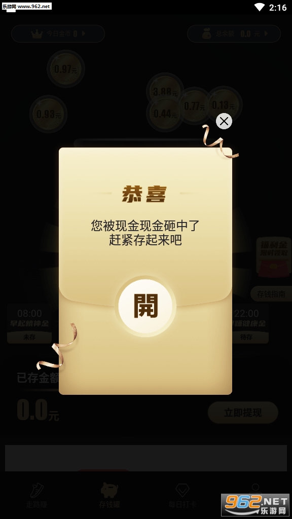 《快乐存红包版》是一款非常给力的手机走路赚钱平台,在这里用户可以通过简单的走路的方式来赚钱,步数越多奖励越多,提现也非常方便,感兴趣的小伙伴快来962下载体验吧!