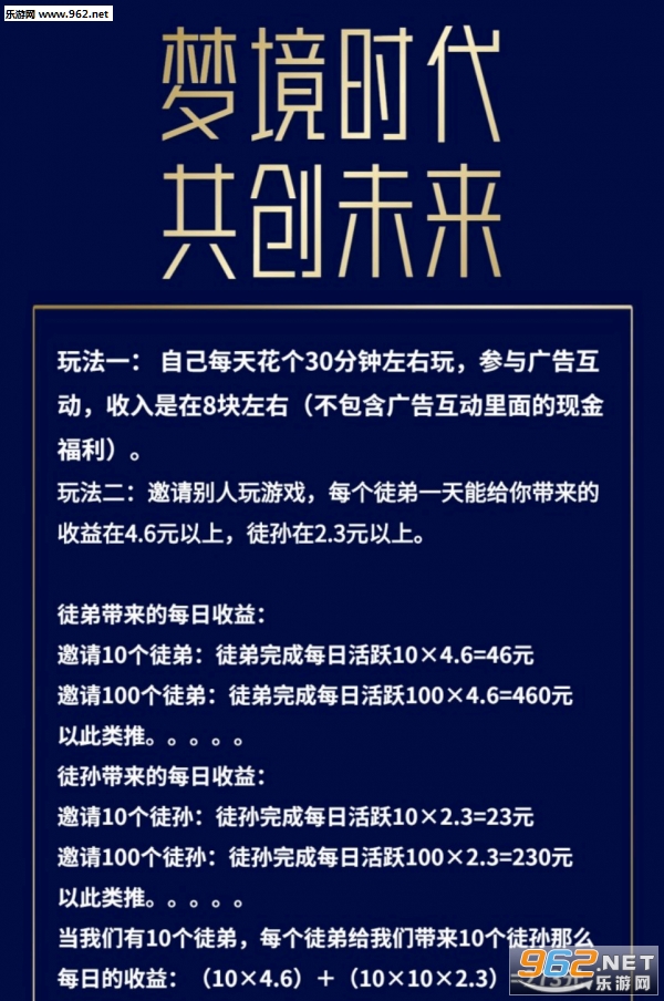 梦境时代APP:合成升级新模式,阶段奖励,团队推广享永久分红。梦境时代APP是一款通过每天玩升级合成赚钱的应用,梦境时代软件上没有任何充值项目,只要在线玩合成游戏看看广告就能赚钱,并且推广梦境时代分红游戏还能享永久分红。
