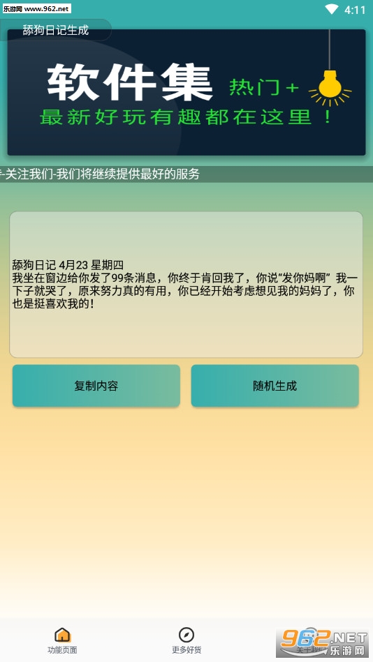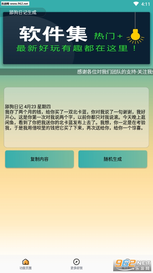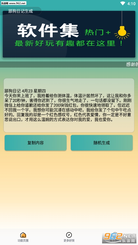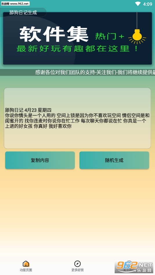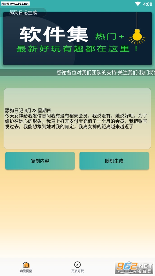一款可以随机生成超多搞笑的舔狗日记短文的App,可复制后发空间、朋友圈或者发聊天群来活跃气氛!