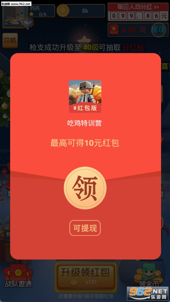 吃鸡升级是一个类似盖楼大作战的升级活动,新人登录送一个红包,领取后直接可秒提0.3元。