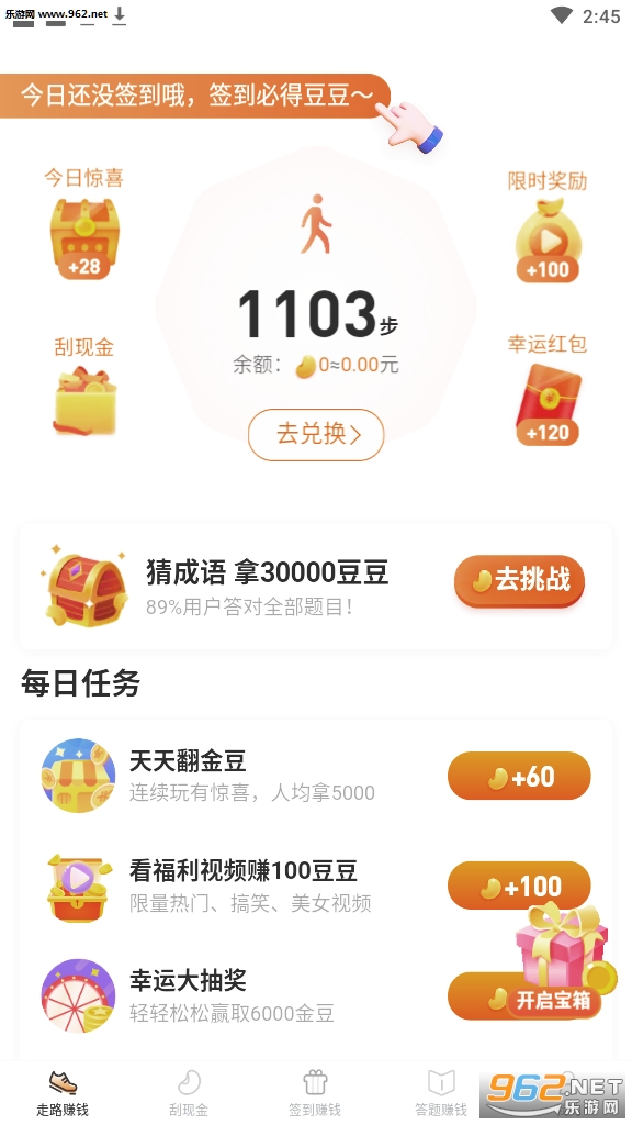 多元化的手机赚钱平台,这里不但可以通过每天的走路来赚钱,也可以通过各种赚钱任务和成语答题来获得额外收益,佣金拿到你手软,喜欢就来试试吧!