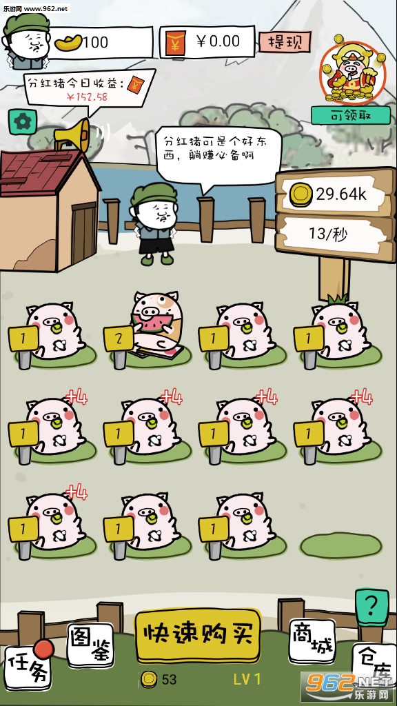 买得起的五花肉是一款老少皆宜的农场养殖经营类游戏,你在农场里面养殖小猪,放置合成等级相同的猪猪可以合成一些比较高级的稀有品种哦,可以卖出更高的价钱,在猪猪成长期间还可以帮你生产钻石哦,可以用来升级小猪,扩大你的农场养殖规模,你还在等什么?我们可是要成为养猪大户的人!