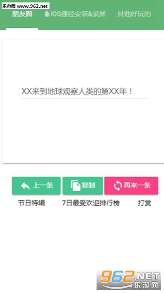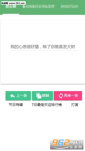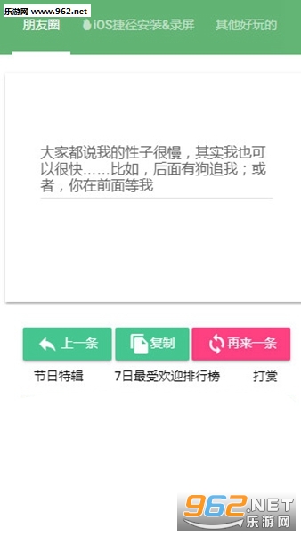 《朋友圈文案生成器》是一款为朋友们打造的朋友圈内容随机生成的软件,不少的朋友喜欢发朋友圈,有时候我们可以发一些特别的内容,无需我们去思考伤脑筋,在朋友圈文案生成器中可以随机生成众多的朋友圈文案,可以从中选择自己喜欢的来发朋友圈。