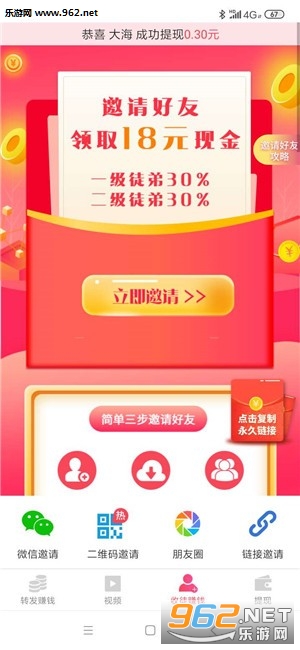 3、邀请好友最高8元平台奖励,永久享受二级下线50%转发收益上贡!