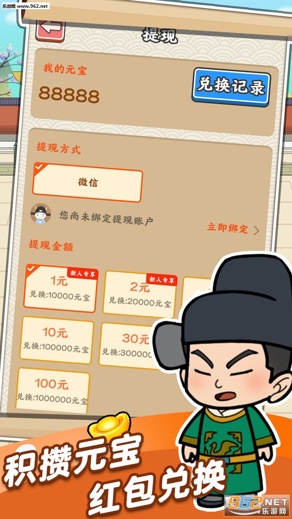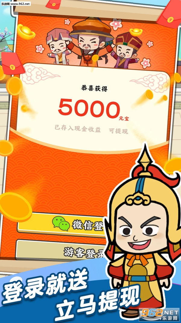 初次登录游戏的玩家可以免费领取5000元宝,积攒足够的元宝就能兑换现金红包;