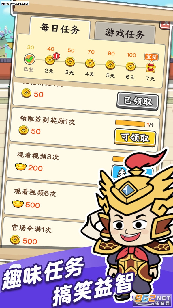 趣味任务轻松做,登陆游戏领金币,看一分钟小视频都可以领元宝;