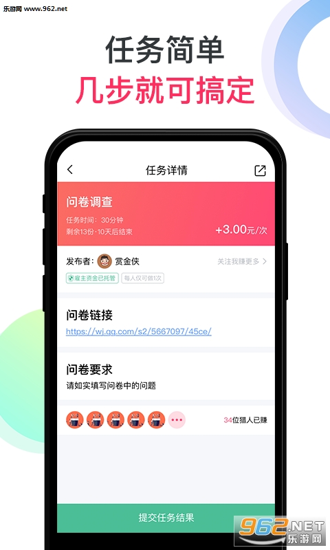 赏金侠是一款超级好用的手机在线赚钱工具。海量的兼职机会,在线参与多款活动。完成任务即可获得奖励。提现速度快,感兴趣的朋友不要错过了,快来下载体验吧。