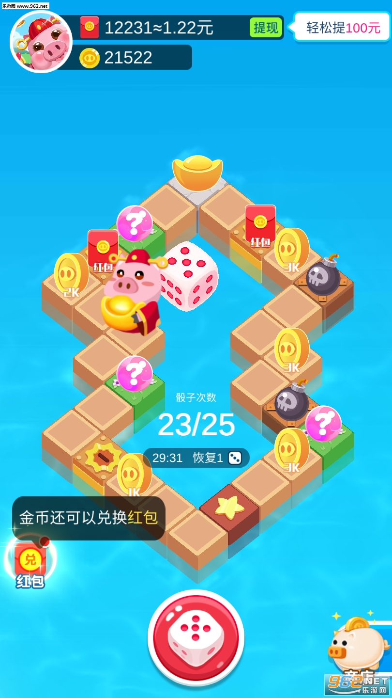 猪猪君要挺住游戏是一款非常休闲有趣的投色子冒险游戏,这款游戏采用了可爱的Q版画风,进入一个极为简约的场景,我们需要在每一个回合中投出自己的色子,让小猪前进对应的步数,每一个平台上都有一些金币或者带有问号的红包,开启这些红包能够让你获得意想不到的收益哦!