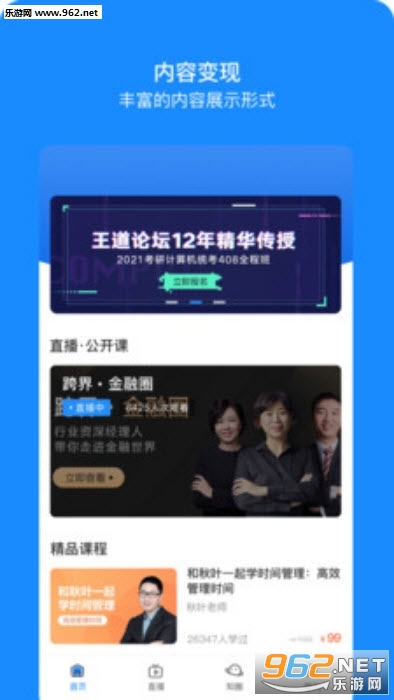 丰富的内容展示形式,图文、音视频、直播,满足各类课程需求