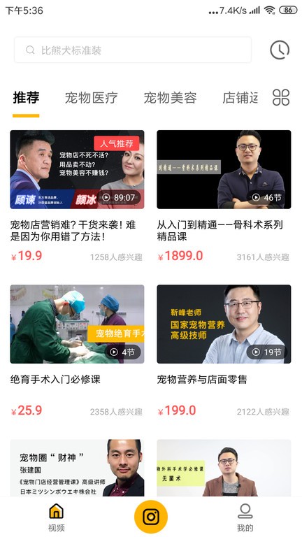 3、进入主界面后可通过宠物医疗美容等分类,查看对应课程。