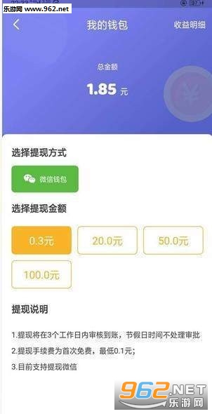 3、首次0.3元就可以提现至钱包,后续满20元才可以提现,24小时内到账,手续费为3%。