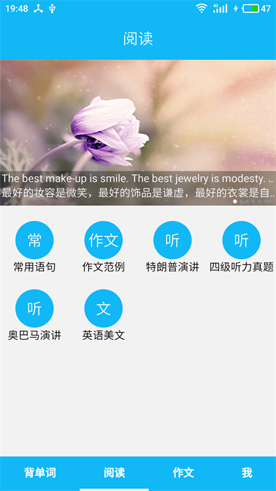 每日一句、特朗普演讲、英语辩论、旅游英语、听歌学英语、文学荟萃,帮助您提高英语阅读能力,场景化的阅读让体验更好