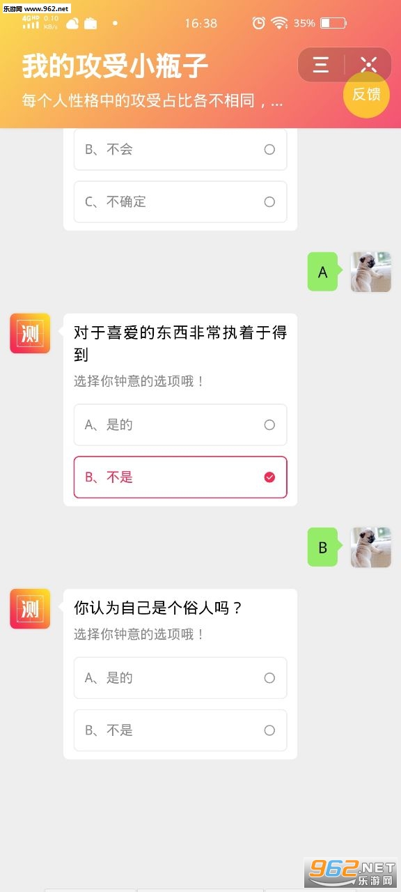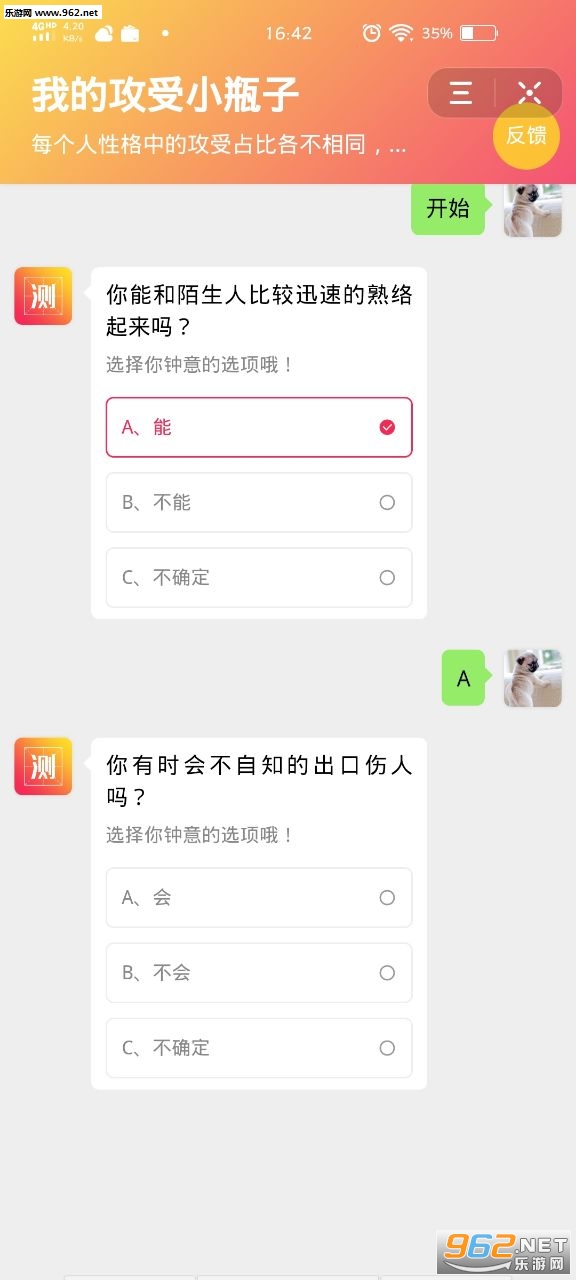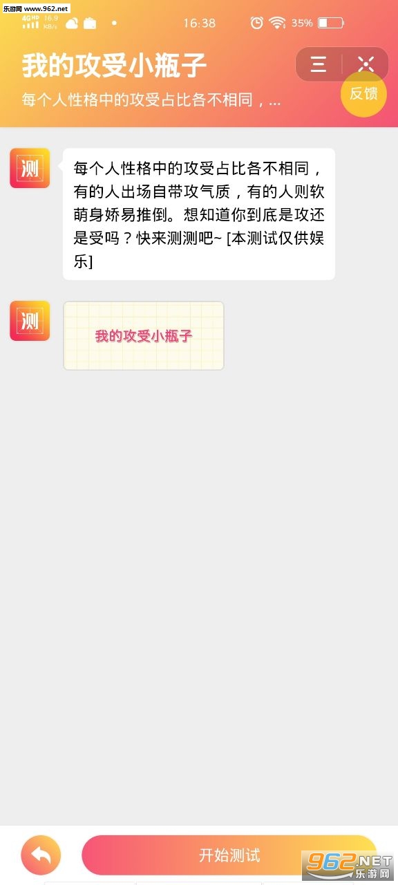 一款完美的掌上恋爱检测平台,软件能够测算出你是攻还是受,非常有意思,而且还提供专属聊天模式,喜欢的朋友快来962下载体验吧!