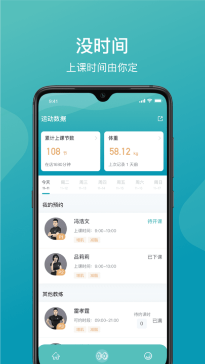 手机视频辅助教练进行健身指导,通过自定义训练课程、推荐训练课程。