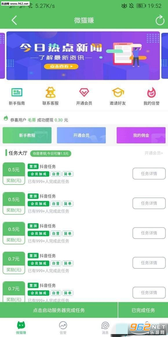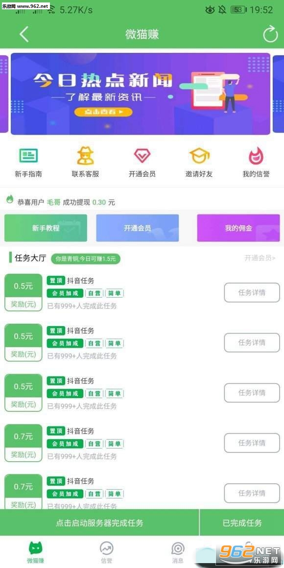 《微猫赚挂机赚钱》是一款可以通过挂机赚钱的手机软件,用户可以使用这款软件来完成任务,不需要花费你很多的时间,你只需要挂机就可以了,非常的轻松,还可以通过分享推广收徒的方式来赚取佣金。