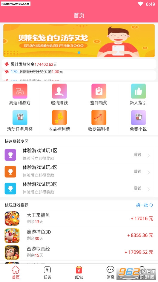 1、新人注册即送1元现金满一元就可提现,主打游戏试玩赚钱,每天更新大量游戏任务,每个游戏大厅都有游戏教程