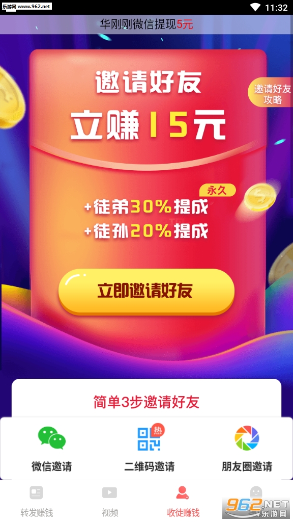 邀请一个好友可赚15元,徒弟首次提现奖励1元,二次提现奖励2元,第三次提现奖励4元,提现累计满100元奖励8元;永久获得一级好友30%+二级好友20%的收益提成。