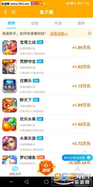 《盒子屋试玩赚钱》是一款为用户提供手机试玩游戏赚钱的服务软件,这款软件里面的游戏种类非常的多,同时都是免费为用户提供试玩的,各种热门的、最新的游戏,用户都可以在这里找到,不仅如此用户在玩游戏的同时还可以获得诸多的红包奖励,还可以进行提现哦,赶快来试试吧!