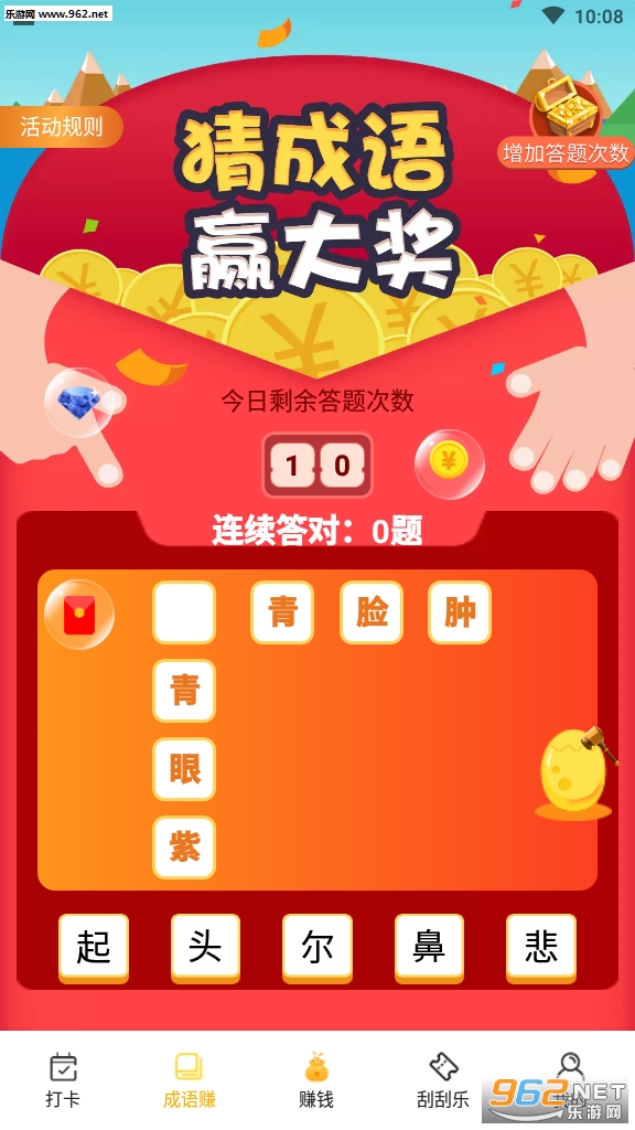 多元化的手机赚钱app,在这款软件中,通过完成打卡任务或者成语答题来赚钱,操作非常简单,是你打发时间的最佳选择,喜欢就来试试吧!