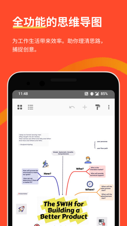 让你专注思维,捕捉每一个灵感瞬间的。每当你有一个想法,都可以快速的通过XMIND来进行记录,不错过任何一次的灵感。