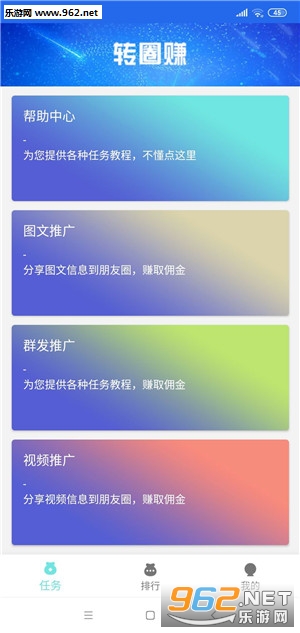 转圈赚-是一款用朋友圈来做任务赚钱的推广类手机赚钱软件,模式简单,无成本、零风险。转圈赚app下载安装后注册登录,通过分享图文/视频等信息到朋友圈即可赚取佣金,一个任务2元左右,任务审核通过佣金到手,新手可以查看首页帮助中心学习教程。