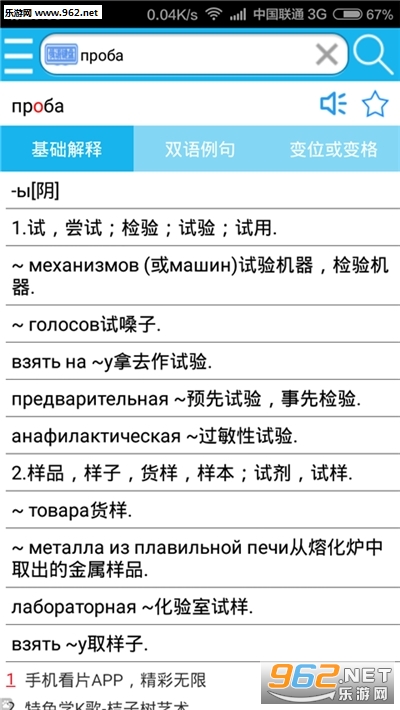 输入俄语单词可以很快的翻译出与之对应的汉语解释、例句和变化.