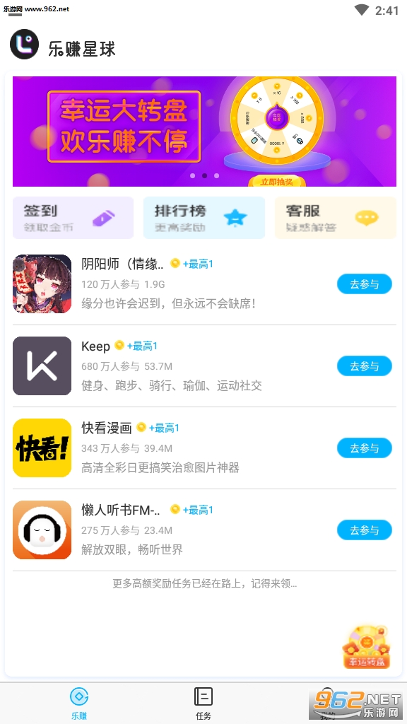 乐赚星球致力于打造一款新形式的生活服务软件,提供更多有用,有趣,有益的内容给大家,首页不定时推出各类高额奖励任务,在满足日常所需的同时,还能躺着赚钱。乐赚星球适合想做兼职赚钱的上班族,学生,宝妈,新职业生活方式,空闲时间,欢乐赚不停!