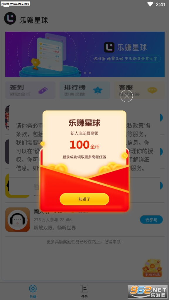 《乐赚星球邀请码》是一款非常给力的手机试玩赚钱平台,在这款软件中,用户可以通过试玩来获得不错的奖励,提现轻松便利,海量收益福利等你领取,完成试玩任务越多奖励越好,感兴趣快来962下载吧!