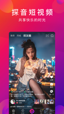 探音短视频安卓版是一款全新的短视频分享平台,汇聚超多网红达人为一体,用户可自由选择特效模板编辑视频,每日热门视频不断更新,附近探优定位搜索。提供强大的视频编辑功能,多种拍摄模式,让你的视频看起来更加丰富,轻松制作炫酷大片。