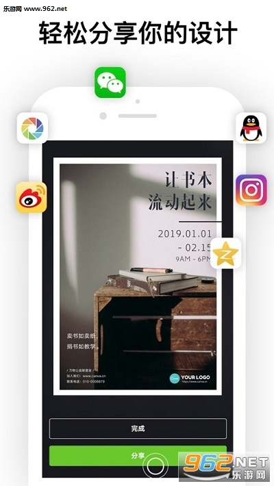 直接将设计分享到Instagram、WhatsApp 或邮箱—也可以直接保存到你的设备。
