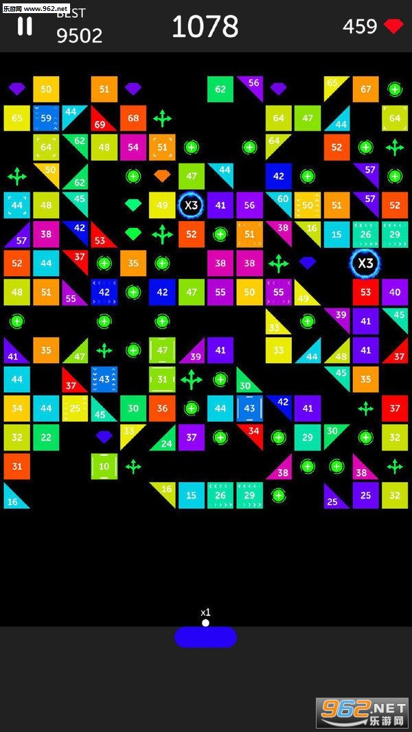 这里是一个色彩斑斓的王国,用不同几何形状的色彩方块打造出来的一个非常奇异的几何世界。而玩家则需要操作一个小球在这个世界中冒险,每一次撞击方块都会有,上面的数字会减少一。通过这种机制来进行不断的闯关挑战,是一款非常经典而又有趣的方块的游戏。游戏中还有着很多的道具会飘浮在空中。