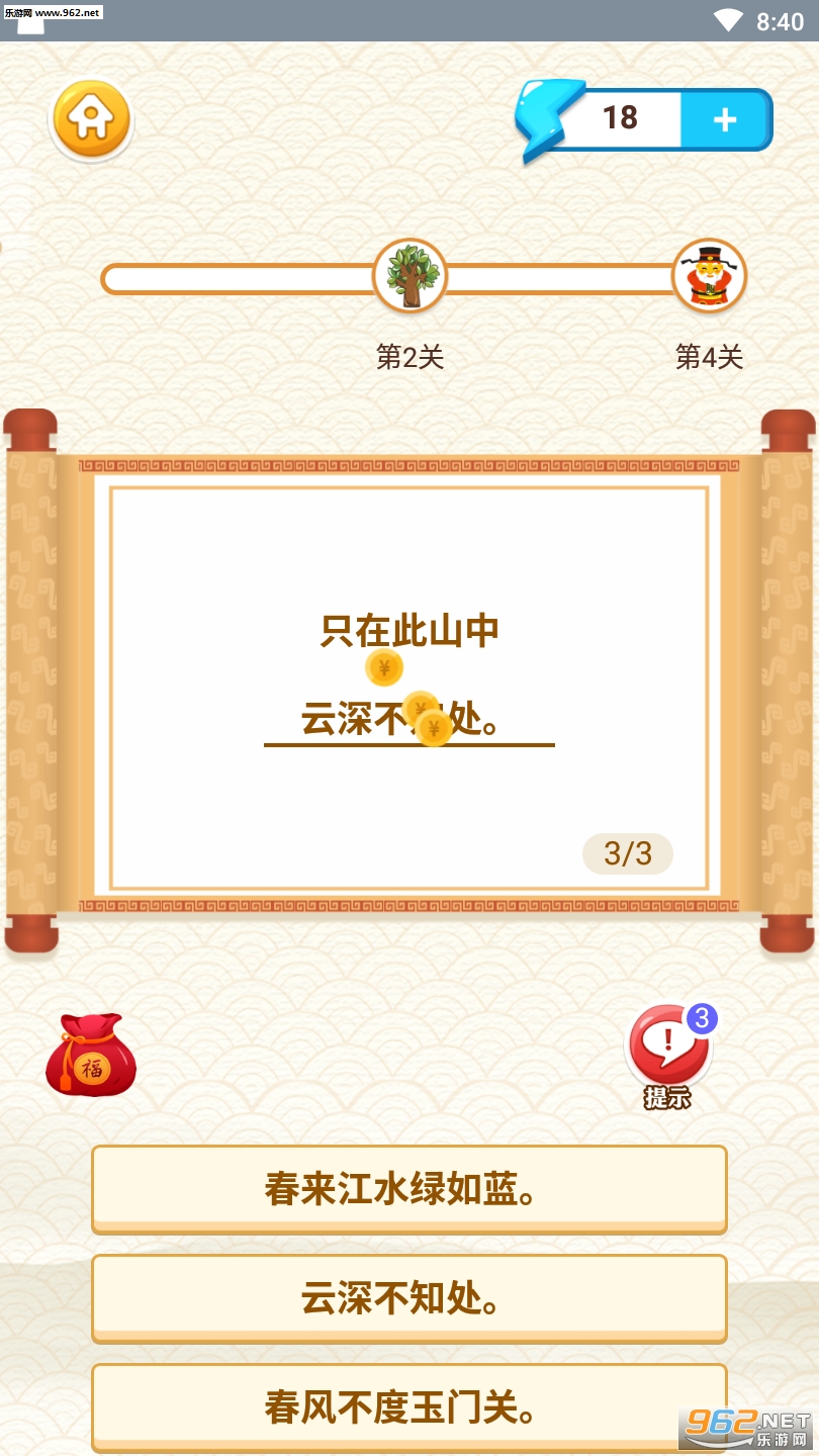 3、因此本关是成语下一关可能是诗词的对接,玩起来挑战性还是很高的哦。