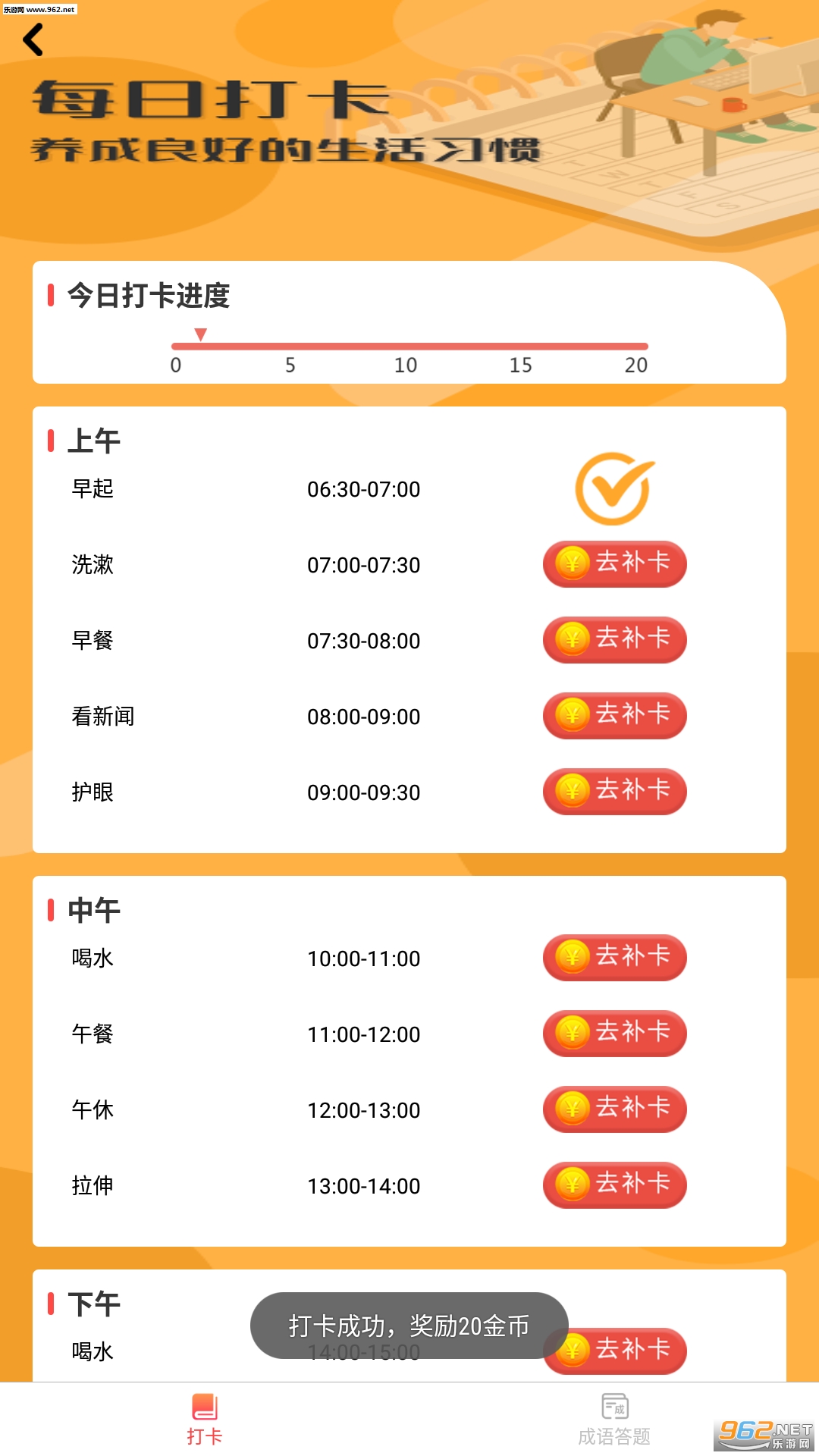 成长赚多多是一款简单的打卡软件,用户可以每天打卡获取金币。