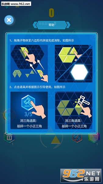 六角消消1010红包版是一款与俄罗斯方块一样的游戏,不过这款游戏是在六角的方块之中消方块,而且游戏中的方块也变成了一个个三角,只要有三角组合形成了一个六角形就会直接消除,并加分,游戏中会随机出现各种三角组合而成的形状的方块,然后拿出这些方块放到游戏的屏幕上方。
