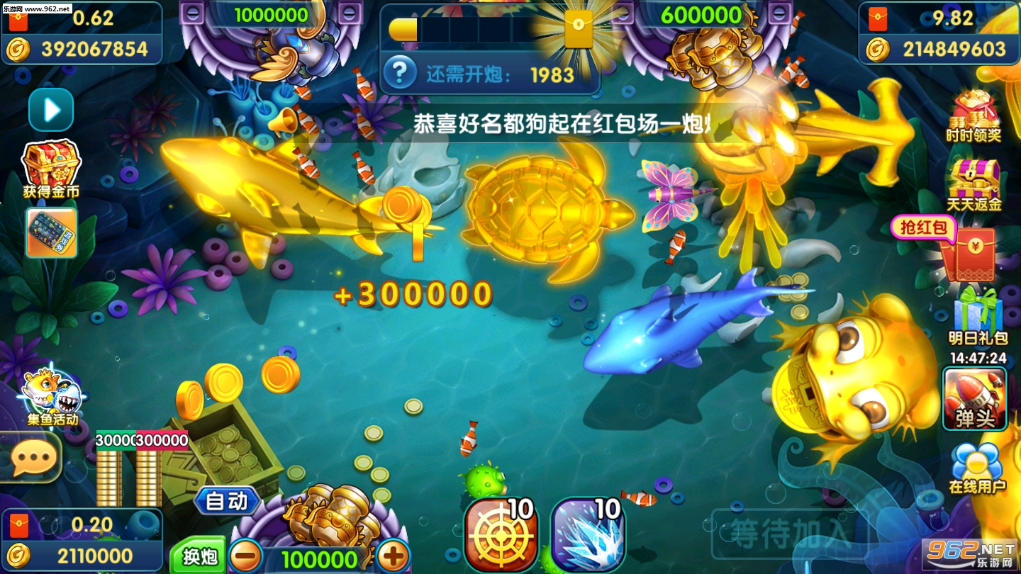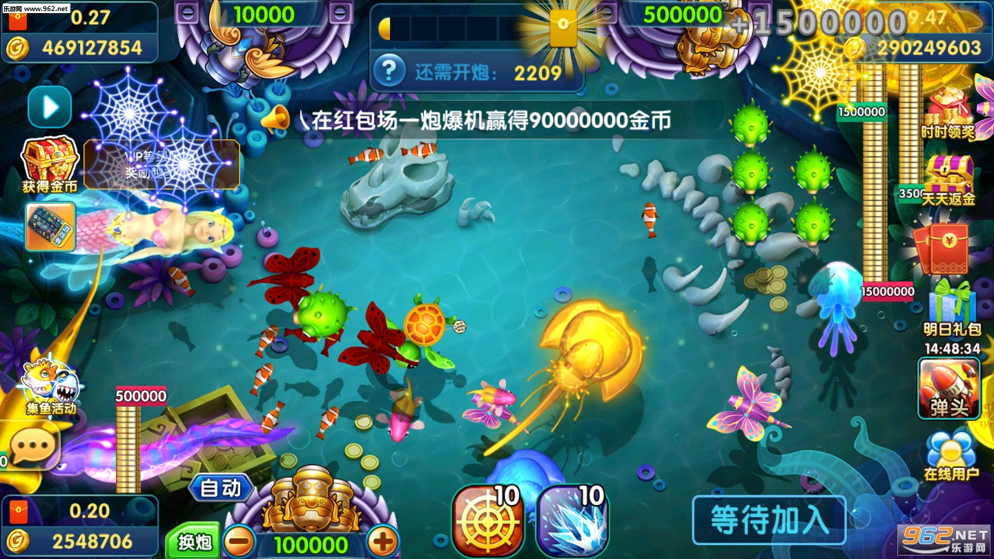2、100%还原经典街机,万人联网,超炫丽画面,30多种鱼类,更有美人鱼、各色鱼阵任你捕获。