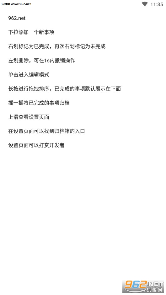 一款非常简单的清单软件,软件中没有任何其他的功能,同时各种各样的记录功能的通过手势来进行快速记录,非常的方便实用,让自己的拥有不同的人生,让你的生活井井有条。推荐给有需要的用户。