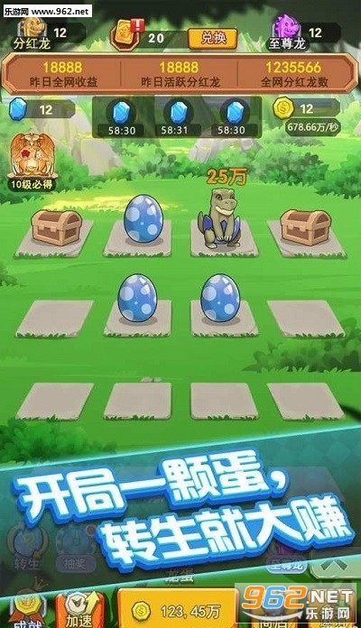 阳光养龙场是一款能够让你在游戏的同时也赚取到丰厚收益的养龙小游戏,恐龙的种类在图鉴为你记录下来,你每解锁一个新的恐龙,就会得到一定的奖励,在后期培养出紫色的至尊龙之后,更是可以拥有全新的奖杯和极大的红包收益。