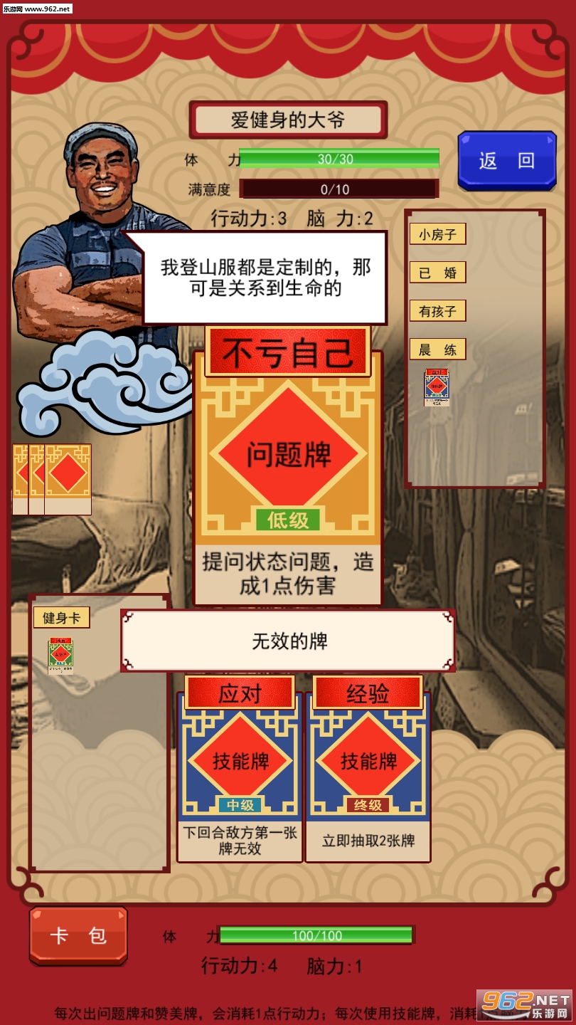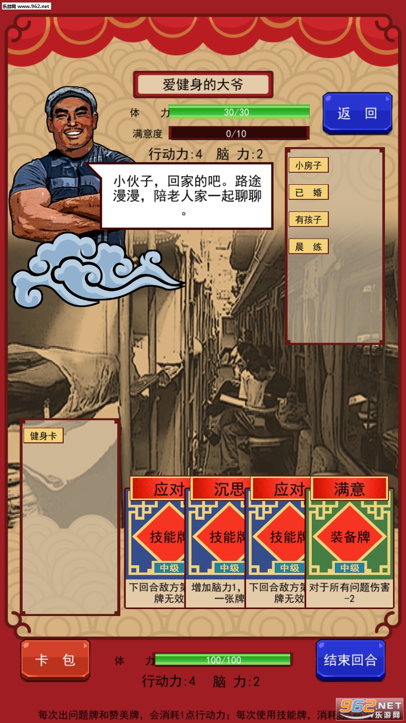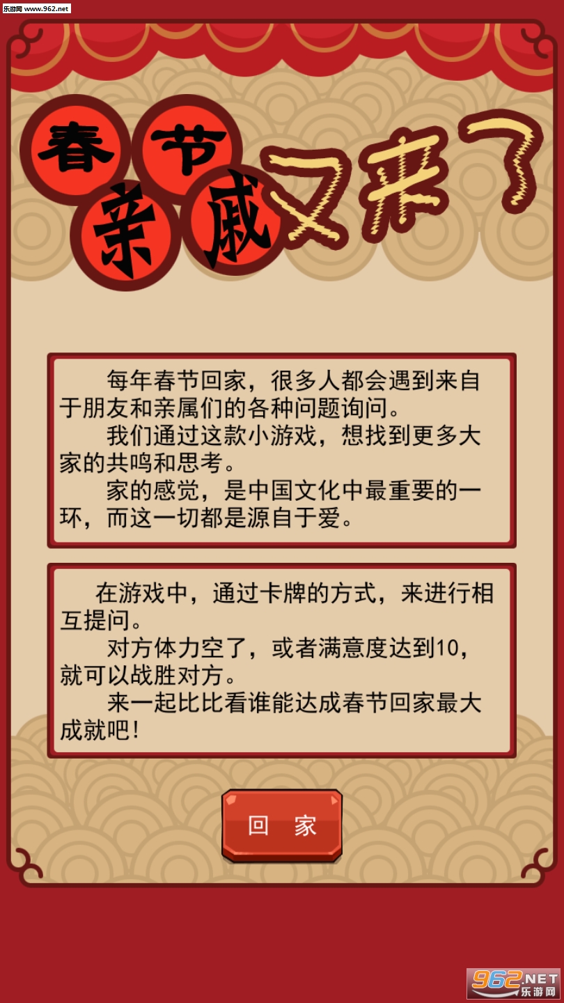 轻松搞笑的卡牌对战类小游戏,游戏中用对决战斗的方式来提现了春节期间遇见形形色色的人聊天的尴尬程度,玩游戏后也能很好的让玩家学会以后应该怎样聊天。