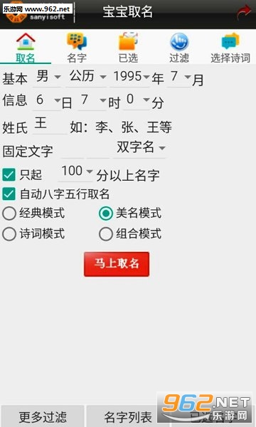 软件分经典模式高分起名、诗词模式起名、美名模式、组合模式好听起名等;