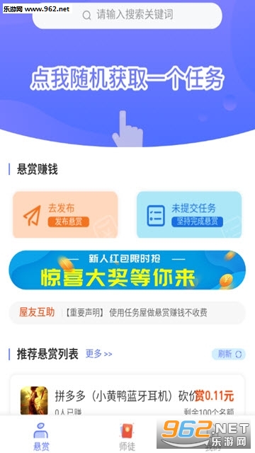 《悬赏屋接单app》是一款非常不错的通过做任务来赚钱的软件平台,平台上拥有更加丰富的任务可以接取让你完成更多的任务获得更多的收益,感兴趣的亲们赶紧下载吧。